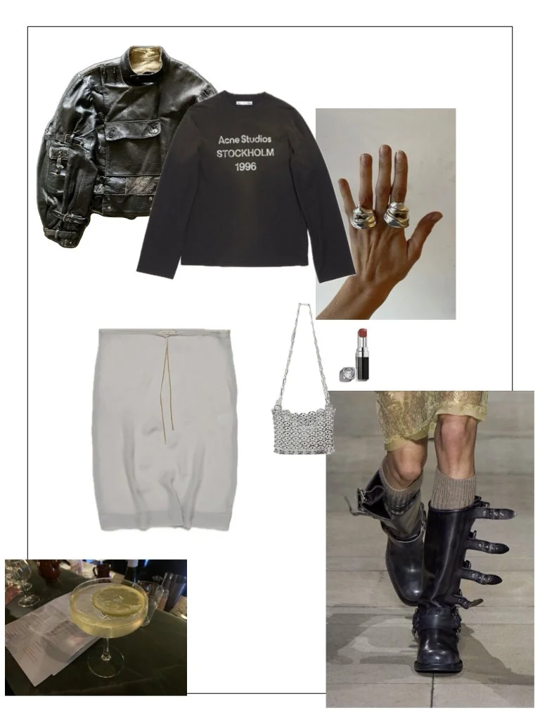 jacket vintage (similar here), longsleeve acne studios, skirt paloma wool, bag rabanne, boots miu miu, rings sumuero