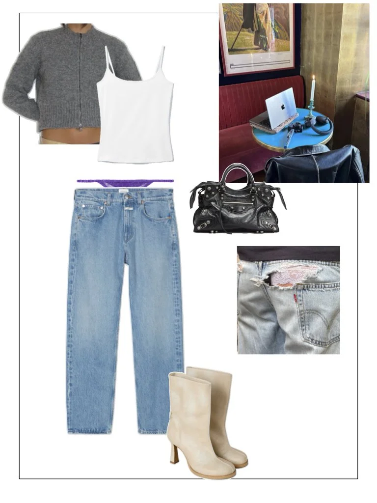 jacket wales bonner, t-shirt saks potts, long sleeve skims, jeans vintage levi’s (similar here), bag balenciaga, boots khaite, sunglasses gucci (similar here)